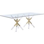 Bring modern pizzazz to your living room with this Mercury Acrylic Gold Dining Table by Meridian Furniture. The base features a pedestal design with acrylic gold legs for a touch of contemporary fun. The tempered glass top offers plenty of room for seating guests for intimate meals together. The top is clear, so you can easily see the beauty of the metallic legs showing through, giving your living room or den a little something extra.